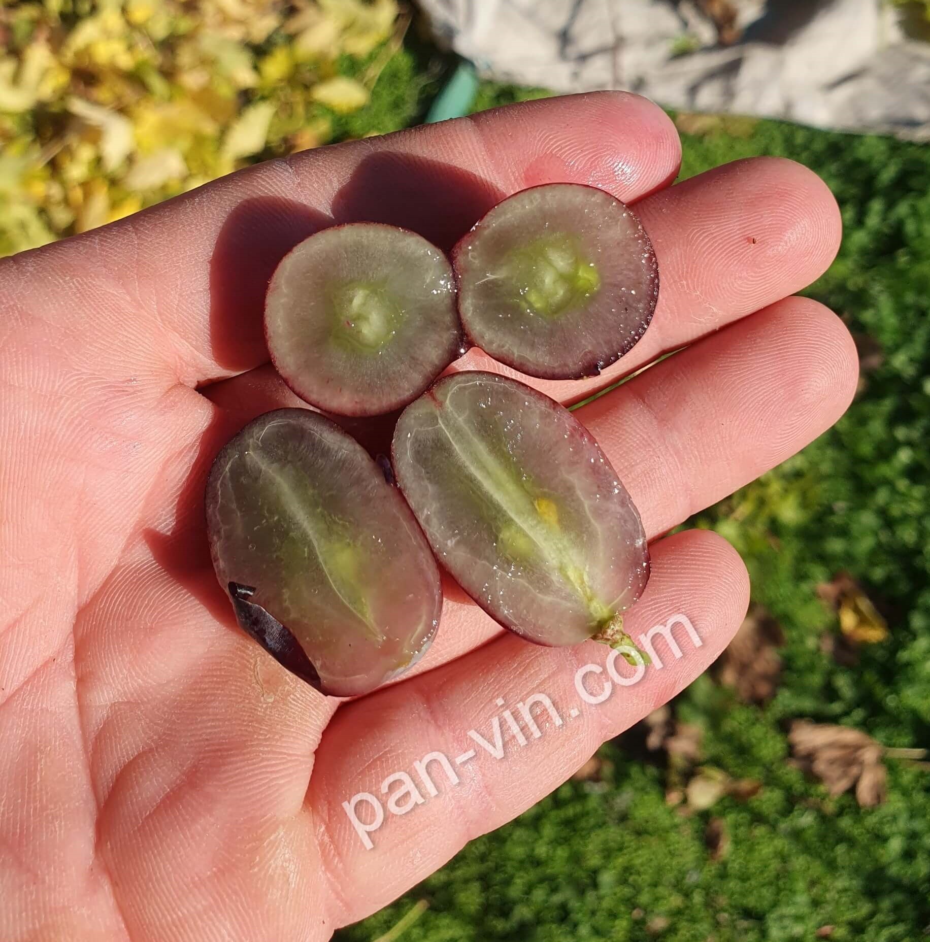 Ягода очень крупная, 8-10 г на сигнальных гроздях. Класс бессемянности высокий, между первым и вторым. Ягода хрустящая, гармоничного вкуса с высоким сахаром и небольшой красной каймой за кожицей. Цвет ягоды от фиолетового до тёмно-синего.